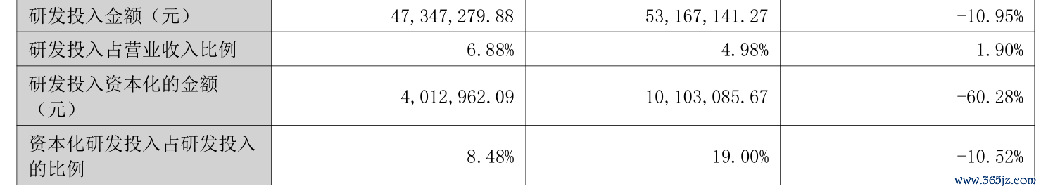 2024年全年,公司研发投入金额为4734.73万元融易富,同比下降10.95%;研发投入占营业收入比例为6.88%,相比上年同期上升1.9个百分点。此外,公司全年研发投入资本化率为8.48%。