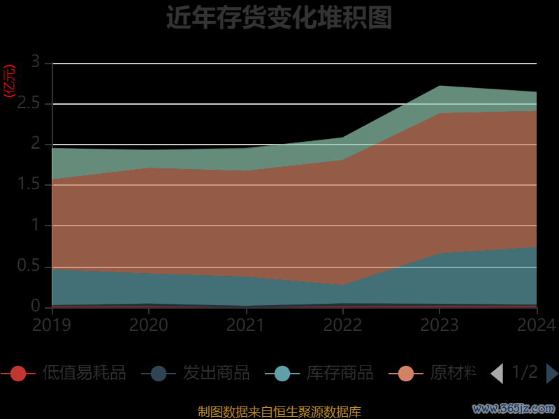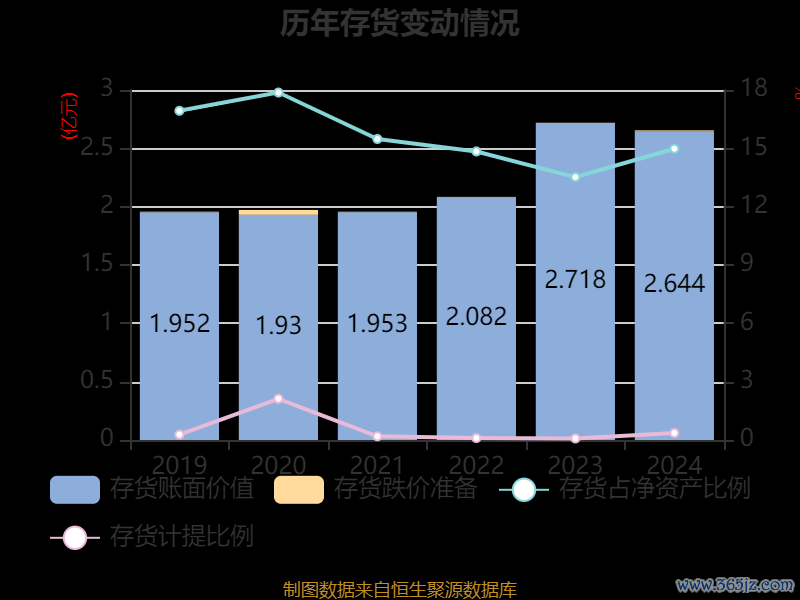 从存货变动来看,截至2024年末,公司存货账面价值为2.64亿元,占净资产的14.98%,较上年末减少745.41万元。其中,存货跌价准备为96.07万元,计提比例为0.36%。