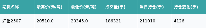 南财智讯6月13日电,南财金融终端盘后期货数据显示第二证券,上海期货交易所的沪铝主力合约收涨0.49%,收盘报20440.0元/吨,日内资金流入9364.52万元。其他相关指标见下表: